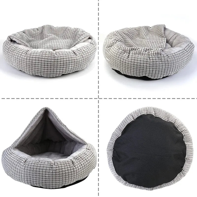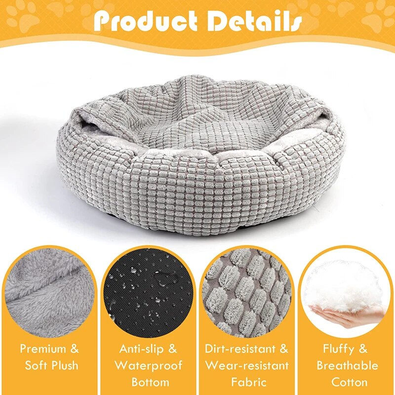 2 in 1 Cave Bed: The donut bed comes with an attached blanket. The hood provides ultra-cozy, breathable warmth and creates a sense of security. Sleeping under the blanket, your pet can not only keep warm but also feel the fun of hiding; Sleeping on the blanket, your pet's head and neck will be well supported by the raised rim.